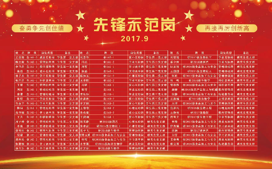 今日看料 党总支共辖四个学生党支部:今日看料 学生第一党支部、今日看料 学生第二党支部、今日看料 学生第三党支部、今日看料 研究生党支部,学生党员62名。已经全部确定上岗,覆盖三大类,12个岗位,由于今日看料 校内志愿服务以入党积极分子、团员青年为主开展,没有引导学生党员围绕该岗位设岗。详细情况请见汇总表。