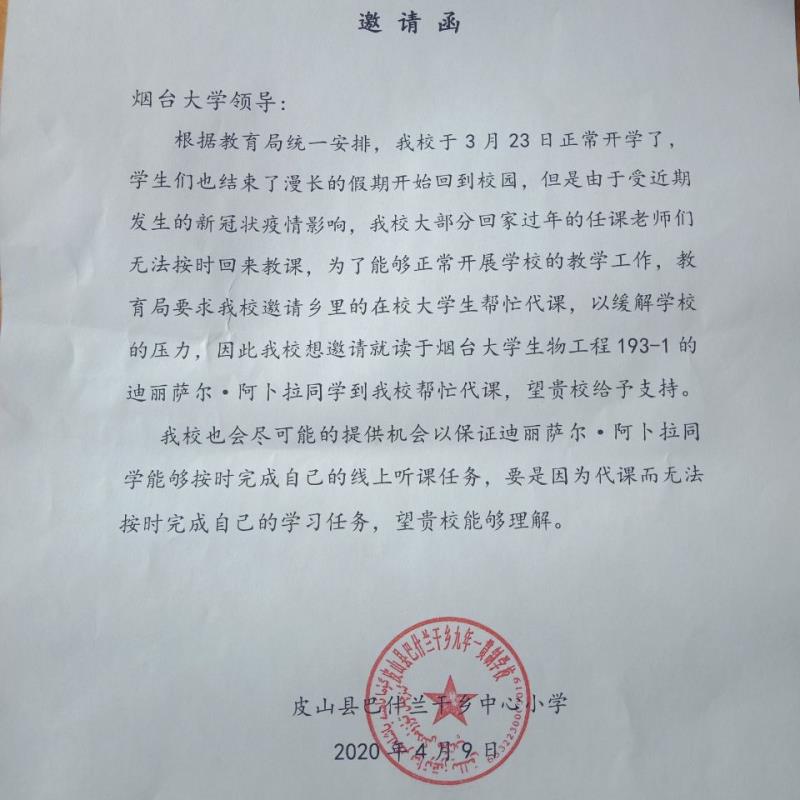 生 193-1 班的维吾尔族学生迪丽萨尔·阿卜拉,积极配合新疆和田地区皮山县巴什兰干乡教育部门的安排,在当地即将开学但诸多老师无法及时返岗教学的情况下,与村里三十余名大学生一起主动担起“支教”责任,坚守在一线支教志愿服务岗位。