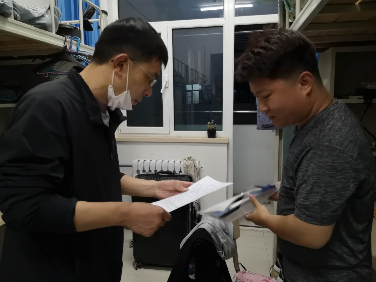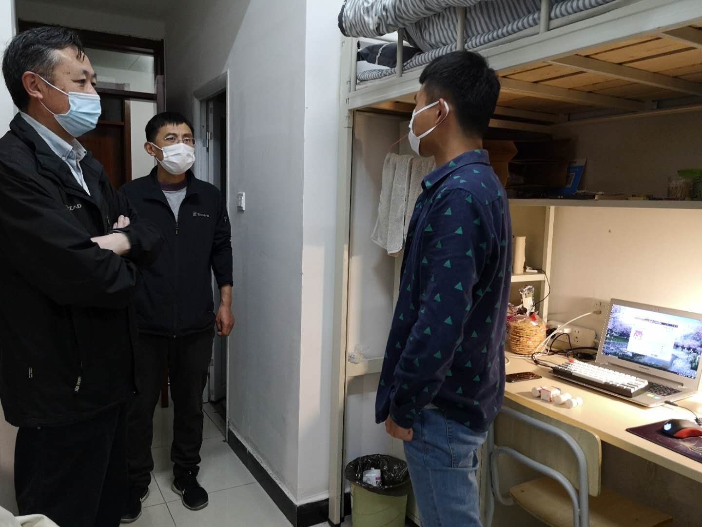 在公寓门口,老师们向坚守在岗位的值班人员表示感谢,正因为他们的默默付出,学生们的返校工作才会有条不紊地进行。 在宿舍中,来自武汉的研二学生田潇然表达了对学校贴心安排的感谢,邬旭然强调,在这场没有硝烟的战争中,我们在党中央的正确指引下,才得到我们在校园里安心学习的机会,在近期召开的两会上,也能看到国家对战胜疫情的信心,我们现在要尽快收心,投入科研学习中来;研一学生赵静从火车站到宿舍,在老师们一条龙服务中安全返回学校,李明月为同学们讲述了接站背后的故事,是学校细致周到的安排、是老师们不辞辛苦的工作,才使得开学进展如此顺利;曹鹏询问了研三同学的就业情况、解答了同学就业困惑,他表示毕业生要对自己的未来做好规划,深造、就业都是不错的选择;