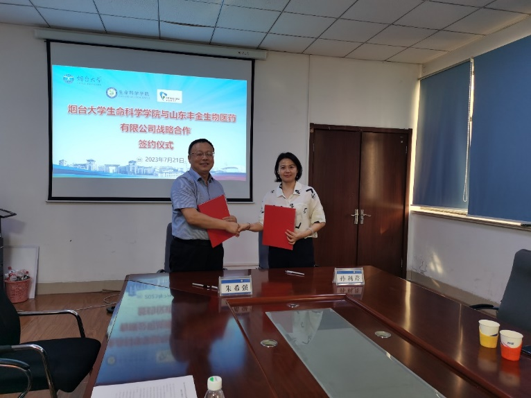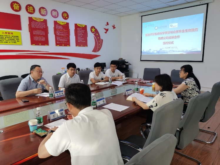 )与山东丰金生物医药有限公司战略合作签约仪式”。山东丰金生物医药有限公司朱希强董事长、学院班子成员、生物工程专业负责人、学位点负责人及部分教师代表参加签约仪式。会议由党总支书记王者旭主持。