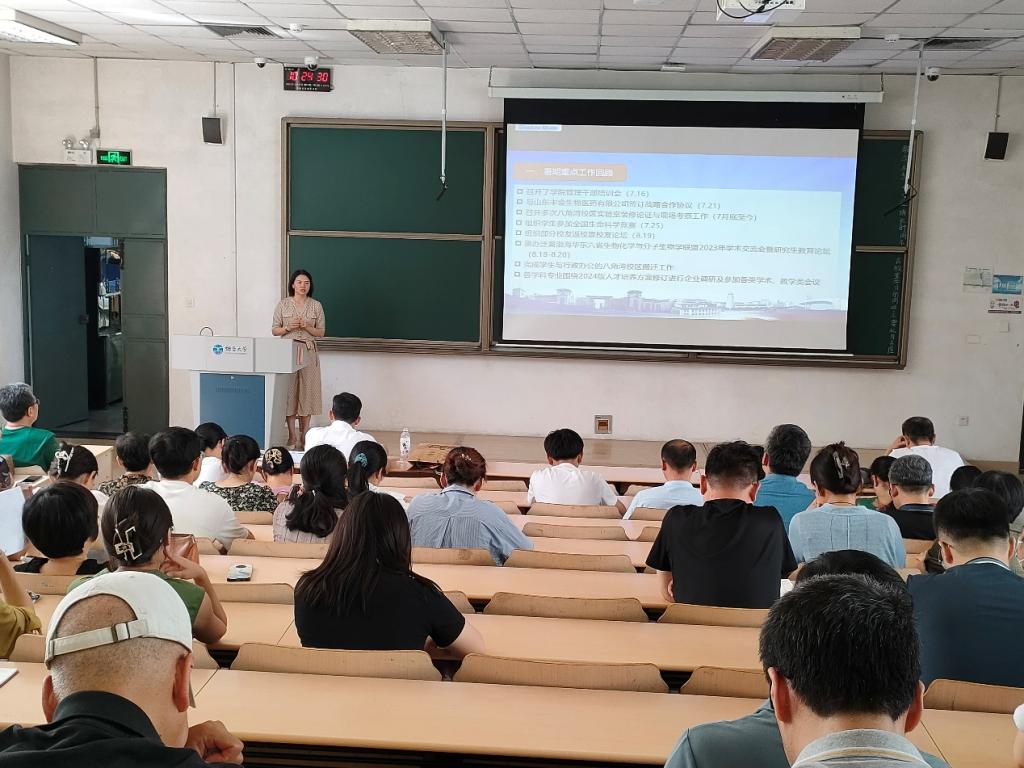 会上,副院长赵振军就实验建设及开发区科教园区搬迁、本科生教学等工作做了相关部署。院长孙利芹分别从暑期重点工作回顾、本学期重点工作、面临的新挑战和新机遇等三个方面进行了讲解,她希望全体教师尽快适应新环境,在新的校区取得更大的成绩。最后,学院党总支书记王者旭就开发区科教园区通勤安全、上好新学期第一课等进行了强调和部署。