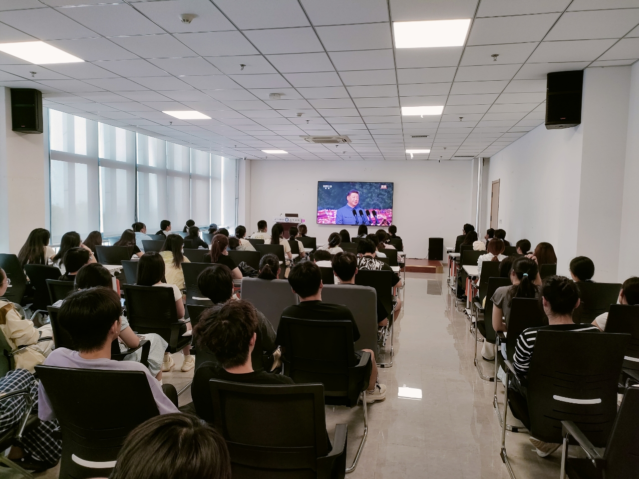 9月3日上午9:00,纪念中国人民抗日战争暨世界反法西斯战争胜利80周年阅兵在北京天安门广场隆重举行,学院组织师生分别在D301、D411会议室集体观看纪念大会直播,共同见证这一庄严肃穆的历史时刻。同时,对不能参加集体观看的师生,要求自行通过“中央广播电视总台”“新华网”等媒体平台进行观看。此次集中观看活动,师生参加人数众多,现场气氛庄重热烈,大家都沉浸在阅兵的激情昂扬和振奋人心的强大氛围中。
